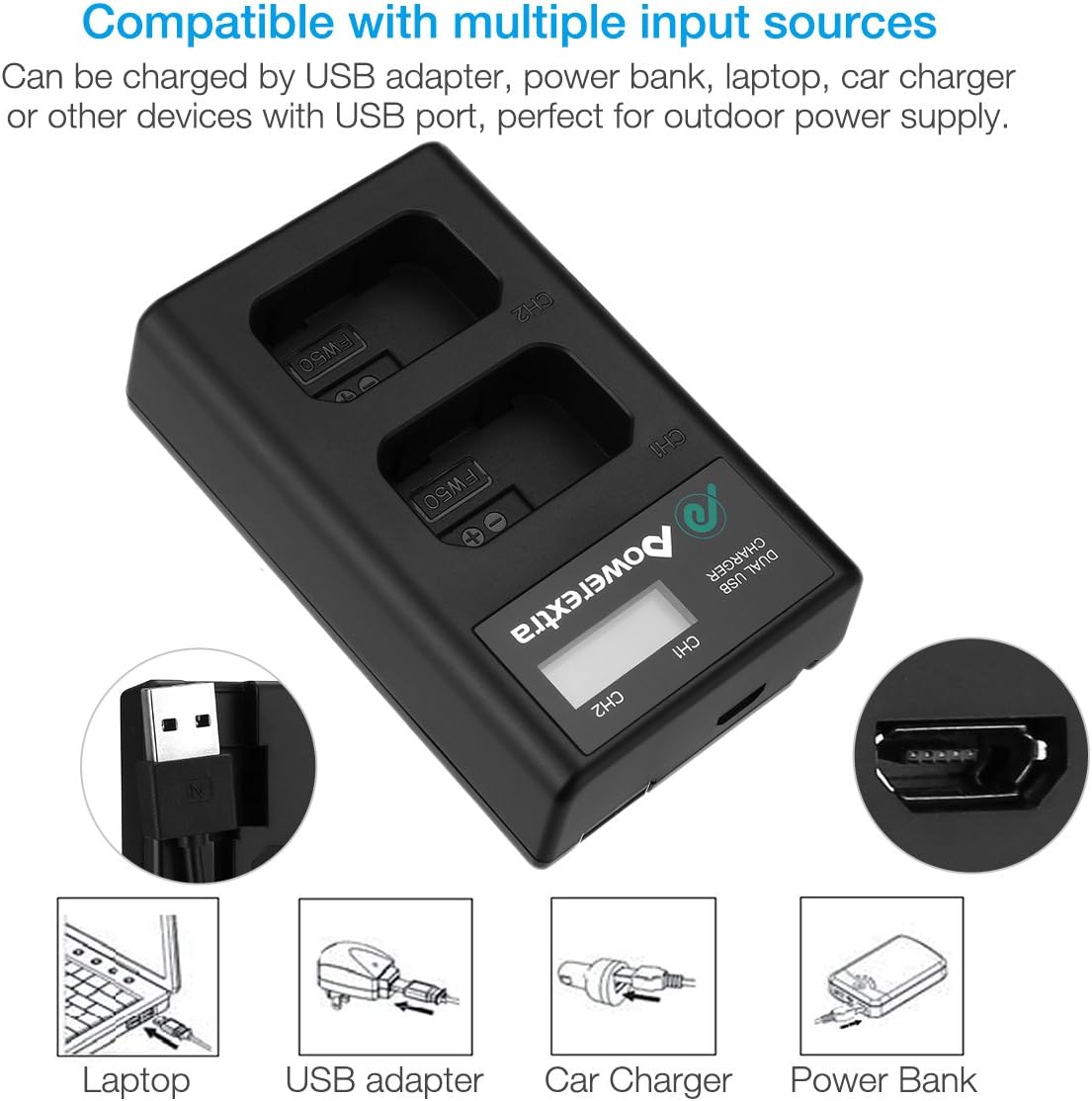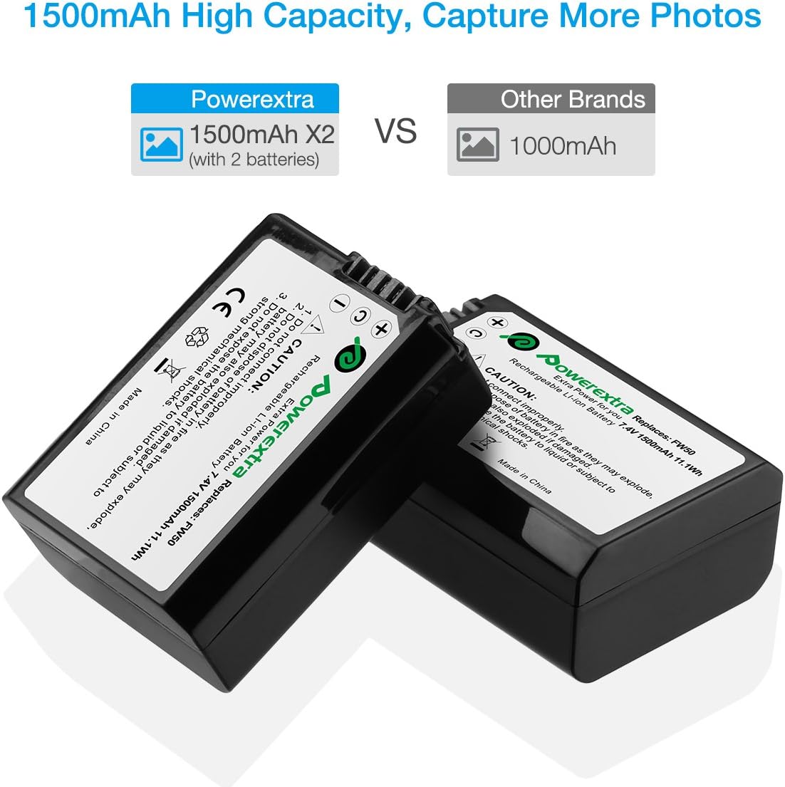 Powerful Battery Capacity: Li-ion rechargeable battery 7.4V, 1500mAh and 11.1Wh, professional replacement for Sony NP-FW50 Battery. Premium Li-ion cells for longer battery life with no memory effect. Fully compatible with the Sony camera, camcorder and charger. , Sony NP-FW50 battery replacement: 100% Compatible with Sony Alpha a6500, a6300, a6000, a7s, a7, a7s ii, a7s, a5100, a5000, a7r, a7 ii Digital Camera. , Intelligent LCD display Charger: Input:5V/2A, Output:8.4V/0.8A*2. It can charge 2 NP-FW50 batteries simultaneously from any USB power source. When Charger is powered on, LCD displays tell you the charging level. , Versatile Charging Option: Convenient USB cable allow you to charge NP-FW50 batteries on the go, just connect with a USB wall charger, car charger, or external battery. Gives you more options than a standard battery charger. , Ideal Backup Solution: You’ll never miss a once-in-a-lifetime moment again by with a new backup package including two replacement NP-FW50 batteries and a dual battery charger, specifically designed for your Sony digital camera. ,
