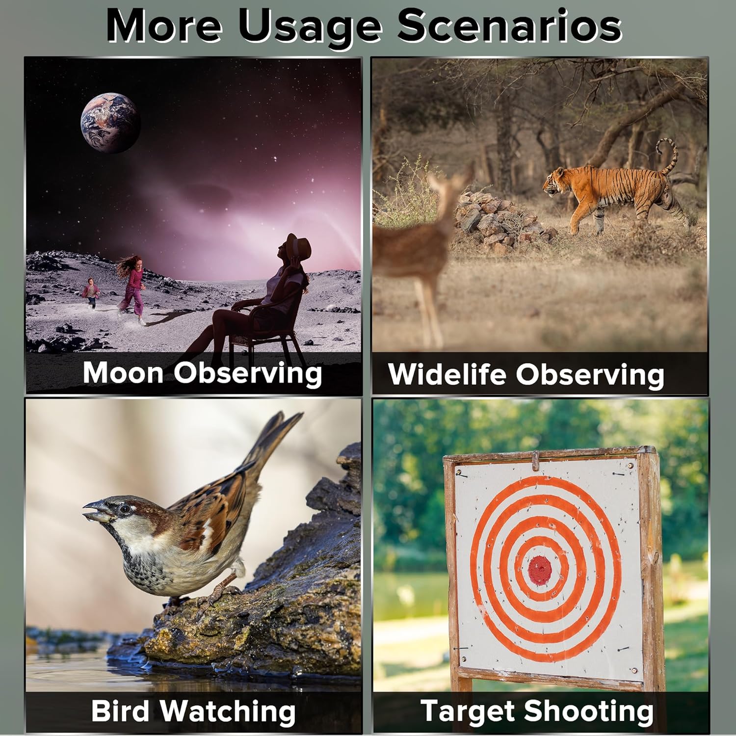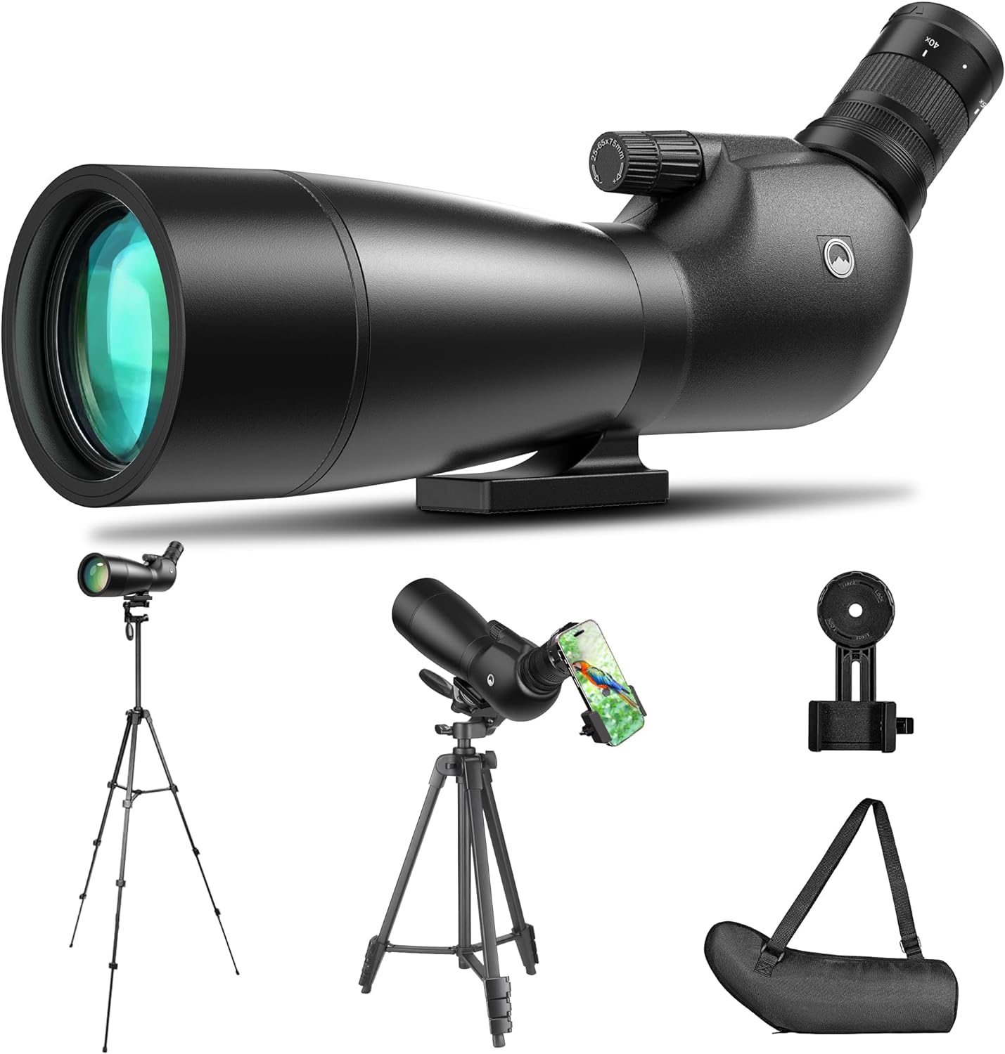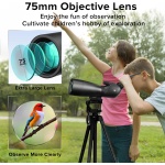 High Magnification and Clarity: Featuring a 25-65x magnification and a 75mm objective lens, this spotting scope offers exceptional clarity for bird watching, ensuring you never miss a detail. , Stable Full-Size Tripod: The included full-size tripod provides a stable platform for your spotting scope, allowing for steady viewing in any environment, perfect for wild animals observing,such as bird watching. , Convenient Phone Adapter: With a scope phone adapter, this spotting scope allows you to easily capture and share your viewing experiences through your smartphone, enhancing your bird watching and wildlife observation. , Portable and Durable Design: This spotting scope comes with a carrying bag for easy transportation and features a rugged design that can withstand outdoor conditions, making it ideal for wildlife observing , Versatile Use Cases: Whether you’re a bird watcher, hunter, or wildlife observer, this spotting scope meets all your needs, offering unparalleled visual experiences in all your outdoor activities. ,