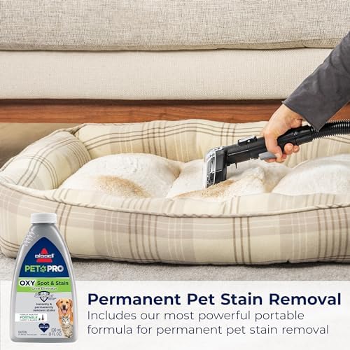 PERMANENT STAIN REMOVAL. Includes BISSELL PET PRO OXY Spot & Stain Urine Eliminator with StainProtect formula, our most powerful portable formula for permanent stain removal and preventing future stains.