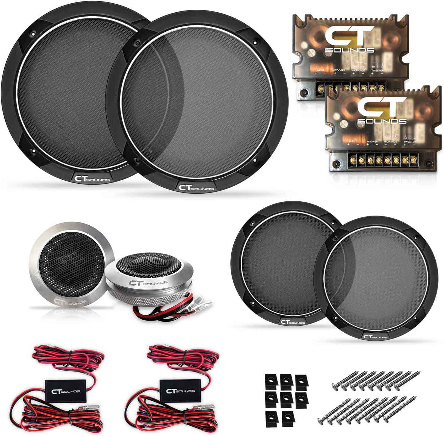 Speaker size: 6.5” 3-way component speaker set, Impedance per speaker: 4 Ohm, Power per set: 250W RMS | 500W MAX , If you want to play your music loud enough for the entire neighborhood here, the CT Sounds Meso 3-Way component speaker set will do just that, and then some , Take your sound to the next level, the meso 6.5 inch component speakers can be turned up uncontrollably loud with no distortion , Included 3.5” midrange speakers feature a neodymium motor assembly and will have your music heard from several blocks away , Included 25mm silk-dome tweeters are housed in a brushed aluminum bracket to keep your ride looking sharp ,
