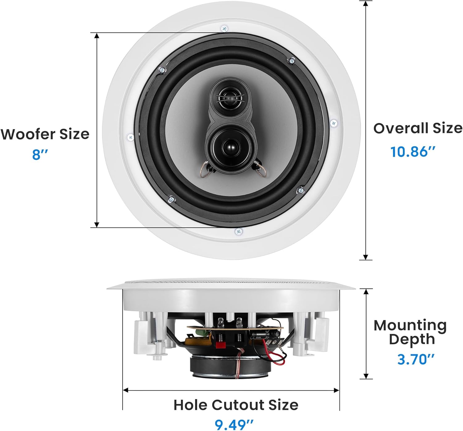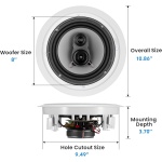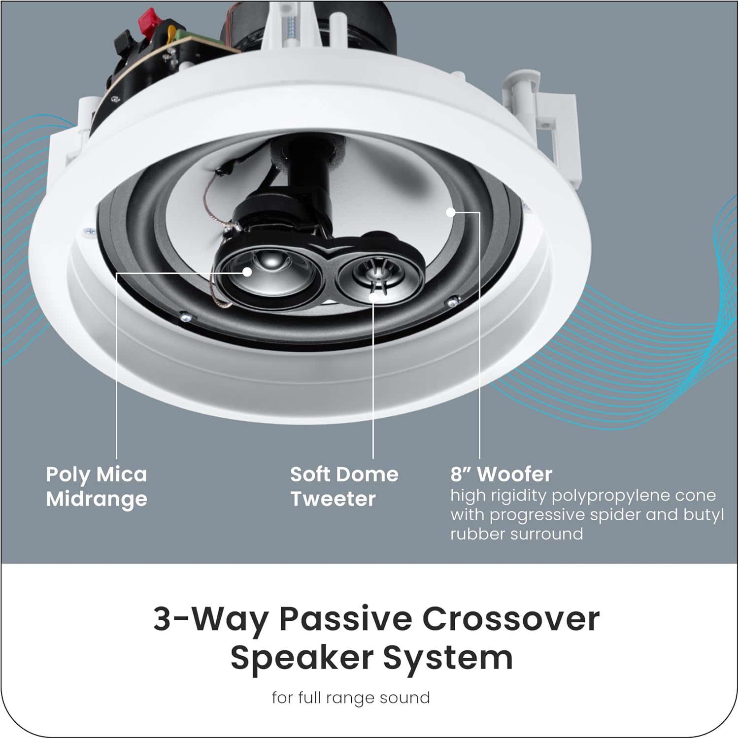 FLUSH MOUNT IN CEILING SPEAKERS – Wide sound dispersion designed speakers easily integrate with new and existing audio systems, traditional Passive speaker design, simply drive power from your home audio receiver or amp , FULL RANGE 3-WAY SOUND – 8″ High Rigidity Poly cone woofers with progressive spiders and butyl rubber surrounds, Poly Mica midranges and 13mm soft dome tweeters, 3-way passive crossovers for greater fidelity, frequency response is 40Hz-20 kHz with 95dB at 8ohm , EASY TO INSTALL – Pressure lock mounting system clamps tight to drywall, fits round speaker hole size of 9.45″ with a mounting depth of 3.78″, overall size of 10.83″ with spring loaded raw wire connections, durable ABS housings and grills can be painted to match your decor , SYSTEM REQUIREMENTS – Any home audio receiver or amp with raw speaker wire outputs, power from your amp should be no less than 10 and no more than 350 watts per channel, CL3 rated in wall certified raw speaker wire to connect your receiver to the speakers , WHAT’S IN THE BOX – 5 Acoustic Audio by Goldwood CS-IC83 speakers, removeable grills, cut-out templates, instruction manual. Use for home theater surround sound, whole house audio systems, business or retail installations ,