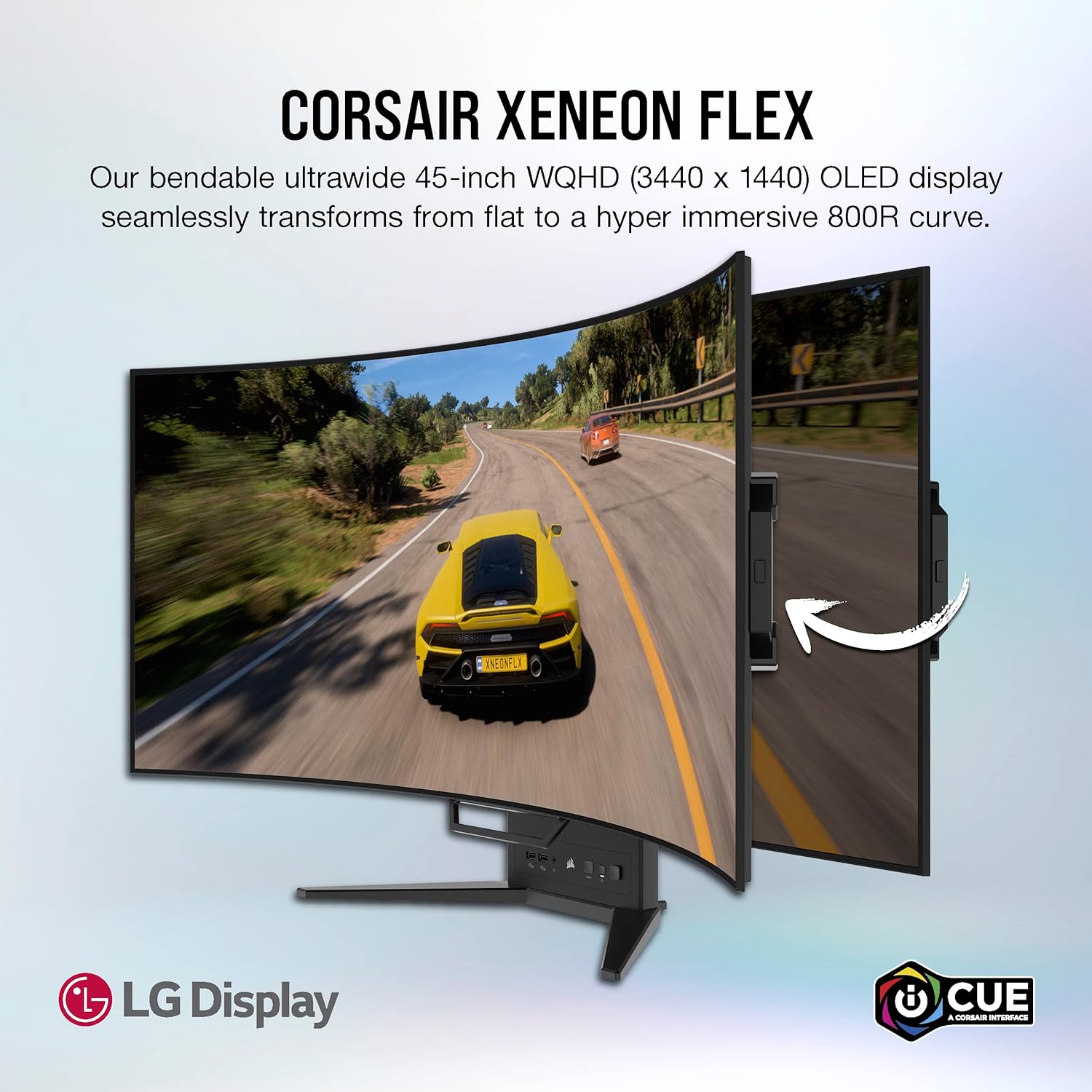 Revolutionary bendable OLED technology, developed by the OLED experts at LG Display, enables you to set the curve of the display from completely flat to 800R. Go curved with Xeneon Flex for immersive gameplay in simulations or flat for strategy games , A huge 45in 3440×1440 display (84PPI) delivers a gorgeous 21:9 cinematic aspect ratio with an ultra-thin micro-bezel , Increase Brightness by 33% and up to 200nit Full Screen with the v107 Firmware Driver Update found on the Corsair Webpage’s Download Tab, updates are .zip files including installation instructions , Experience a new class of high refresh rate performance, with 240Hz refresh rate and a phenomenal 0.03ms GtG response time made possible by LG OLED technology , The latest OLED technology effectively eliminates motion blur for a new level of realism during fast-moving scenes and gameplay, while NVIDIA G-SYNC compatibility and AMD FreeSync Premium certification ensures silky-smooth images , Every OLED pixel is self-lit, so you’ll see the tiniest spark in the darkest void with absolute precision and clarity. HDR with up to 1,000 nit brightness combines luminous highlights with the deepest of blacks and 99% DCI-P3 color gamut ,