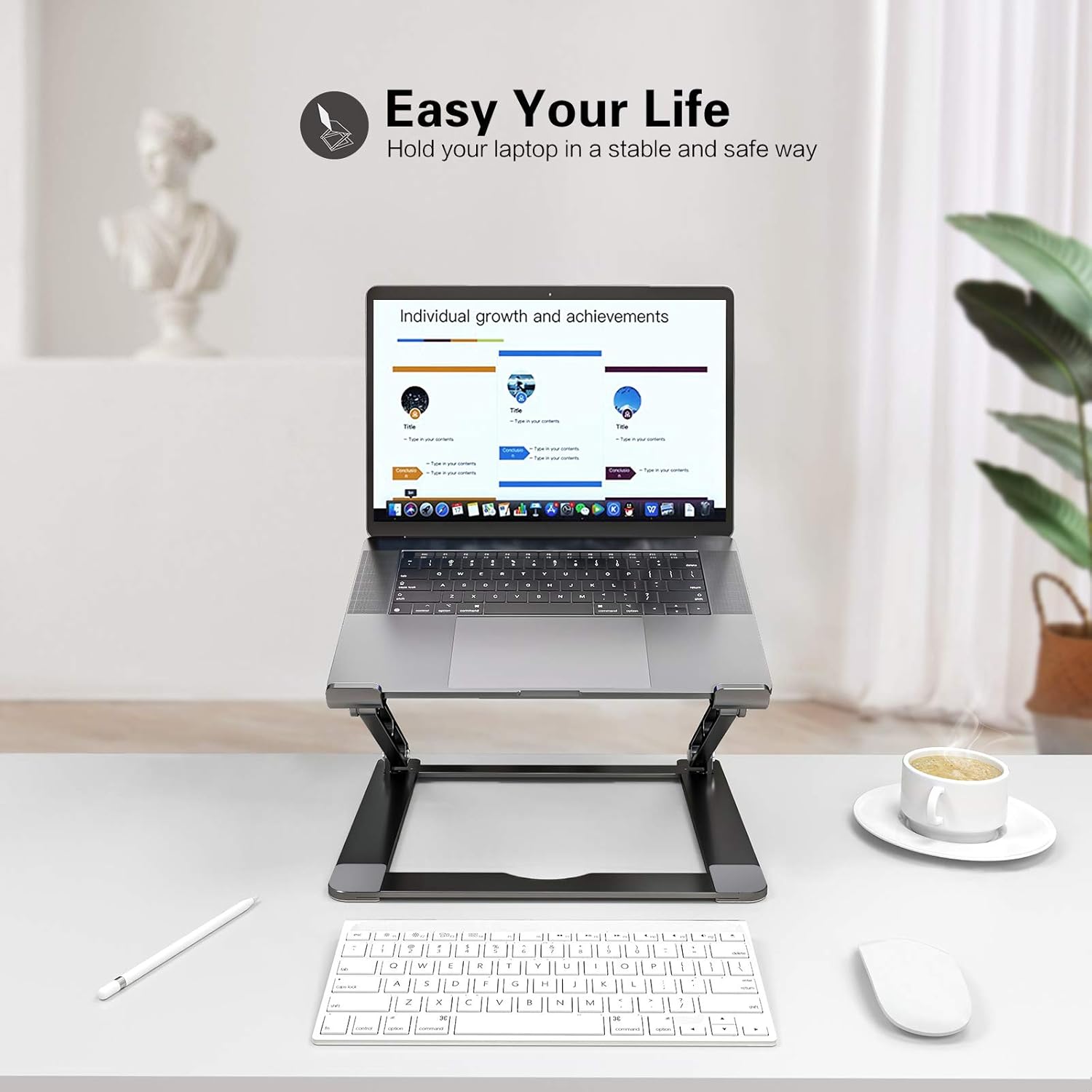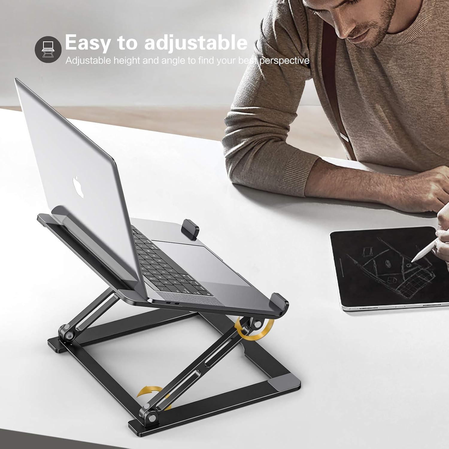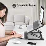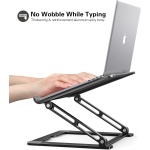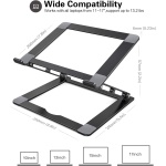 【Foldable & Portable Laptop Stand】Our laptop stand can be fold flat if you need to store it, create extra space on your desk and keep your desk clean and organized, The hollow design laptop stand for desk allows your laptop always to be cool, multi-use on office, meeting room, library, kitchen and music playing house to hold the laptops, tablets, projectors, menu, music books, magazines etc.. An excellent useful gift for your friends and family. , 【Ergonomic Design Adjustable Laptop Riser Holder】The ergonomic laptop desk stand works as a raiser to elevate the laptop screen to your eye level With adjustable heights of 0 ° to 90 ° and tilt settings, fixes your posture and frees you from back/neck stiffness wherever you are sitting, standing, adjusting an ideal height for typing, watching and sitting. , 【Stable & Protective Computer Stand for Laptop】The adjustable height laptop stand is Made of premium aluminum alloy, the notebook stand is quite sturdy and has a smooth edge that protects your laptop from being scratched. With rubber pads on the top surface and front lip, hold your laptop stable in place and no worry about any scuffs on your pretty notebooks. , 【Stand for Laptop Keep the Laptop Cool】The laptop cooling stand is designed with an Open-air design that allows airflow to continuously cool down your laptop in order to prevent overheating, and thanks to its aluminum material design, can absorb and vent heat easily quickly. Also, you can organize your office items such as keyboard and mouse under the thin stand.It will be a good partner for your work. , 【Wide Compatibility Laptop Stand】This macbook stand can work with all laptops from 10 to 17.3 inches;such as Mac MacBook Air Macbook Pro Microsoft Surface Google Pixelbook Dell XPS HP ASUS Acer Chromebook. ,
