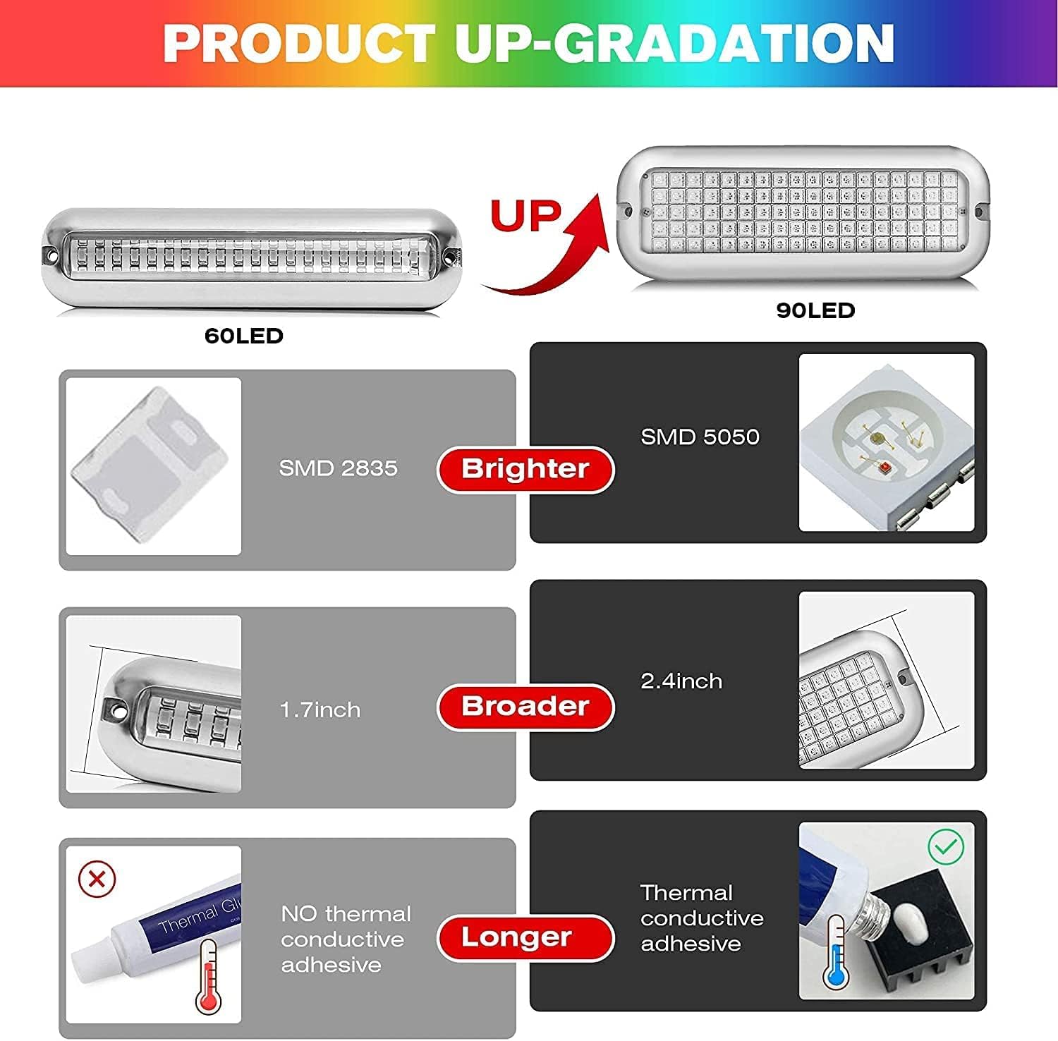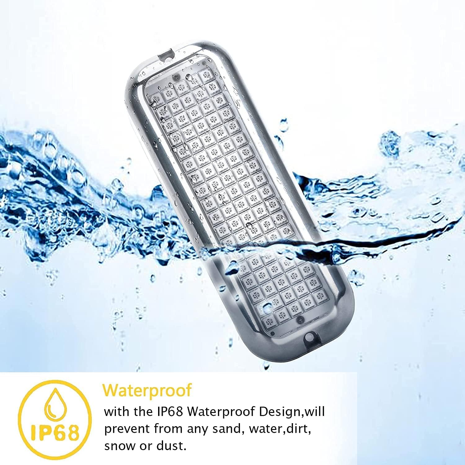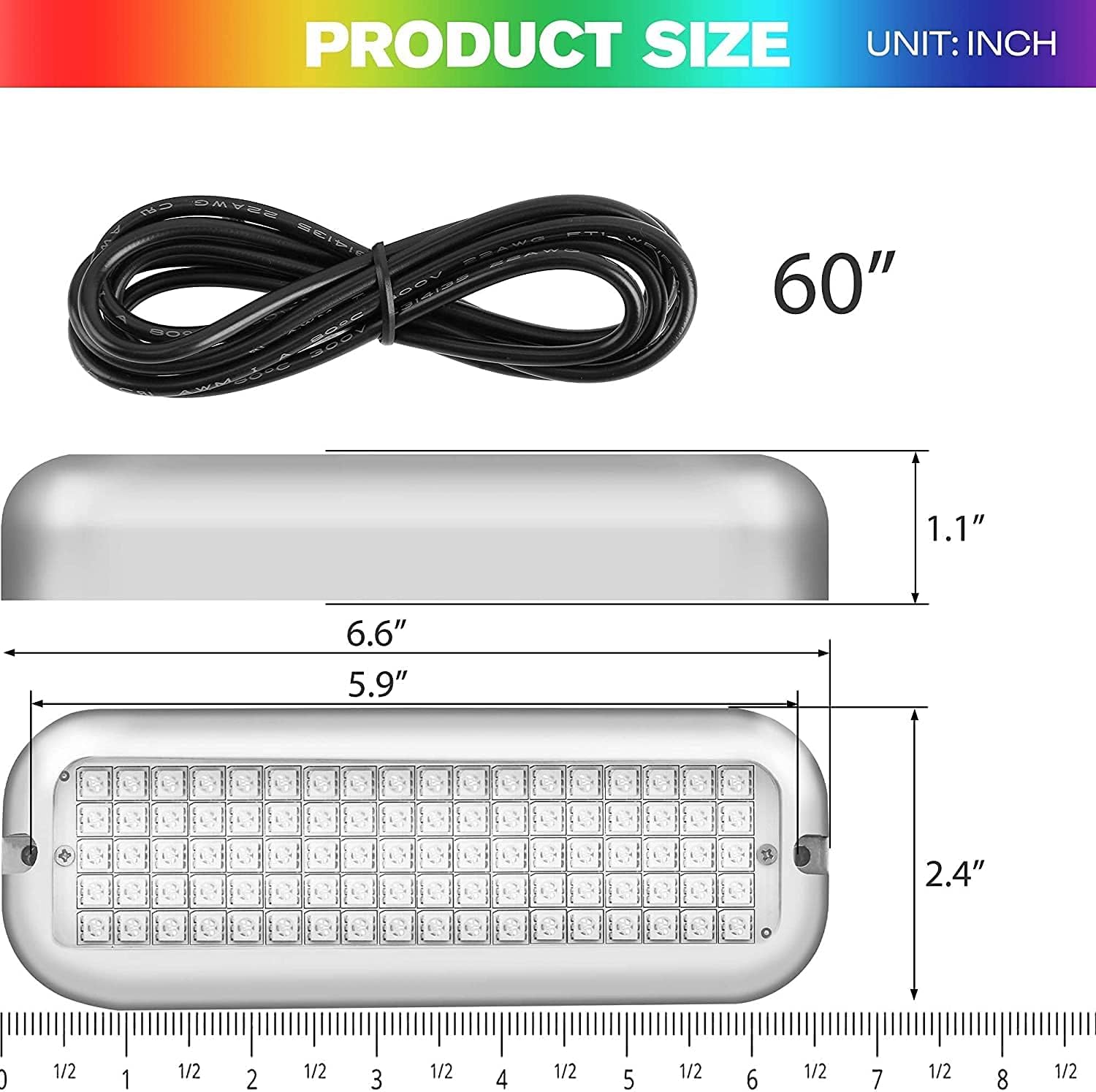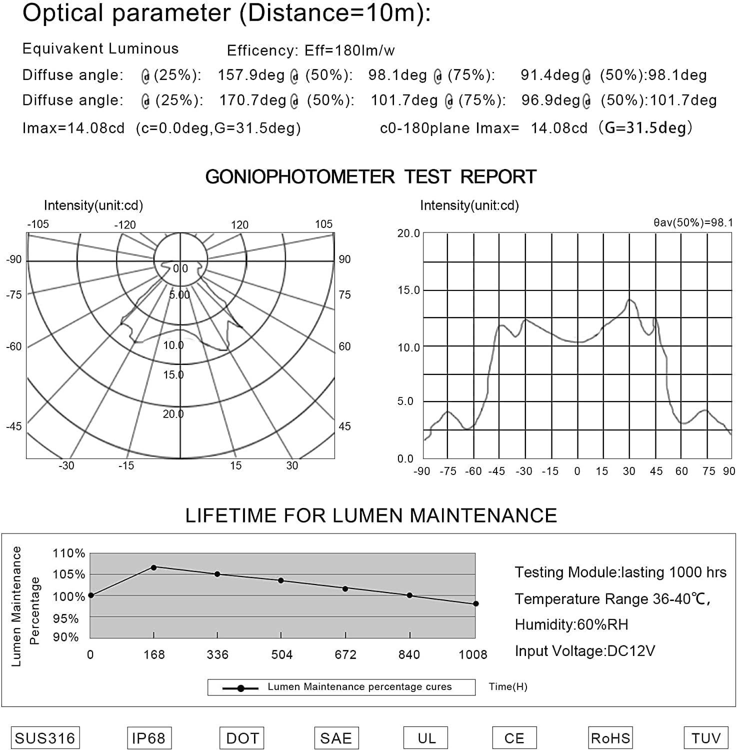 【TOP MARINE MATERIALS】2.0 Upgrade Full Glue!!! IP68+ Underwater 20M✔ Upgraded Double-layer Waterproof Technology✔ High-brightness SMD5050LEDs✔ Anti-corrosion 316 Stainless Steel Cover✔ High-strength PC Shell✔ Tinned Copper Wire✔ Personalized Wiring Port✔ 50000 Hours Life✔ DOT & SAE Certification ✔ 120° Wide Angle ✔ 10-36V DC ✔ , 【PROFESSIONAL TESTING】▲Waterproof: 20m deep sea water test for 6 months ▲Anti-corrosion: 1000 hours CASS test. ▲Impact resistance: CNAS test. ▲Service life: 5000 hours aging test. , 【VARIETY OF OPTIONS】A variety of marine lights with different functions and shapes. From 18 to 84 LEDs, 3 to 7 inch, 120° to 180°, monochrome to RGB kit. All you need is in HUSUKU. , 【EASY TO INSTALL】There are only 2 lines (&-) and 2 screw holes for each Light. This means you only need to fix the light and connect the wire to the power supply. The wire can be straight out or side out, very humane. , 【3 YEARS WARRANTY】Any dissatisfaction within 1 month can be returned and exchanged for free. Any quality problems can be exchanged for free within 3 years. Tell us any questions through Amazon, and our team will help you until you are satisfied. ,