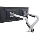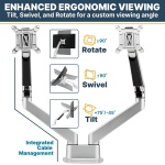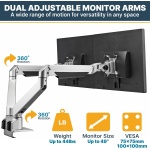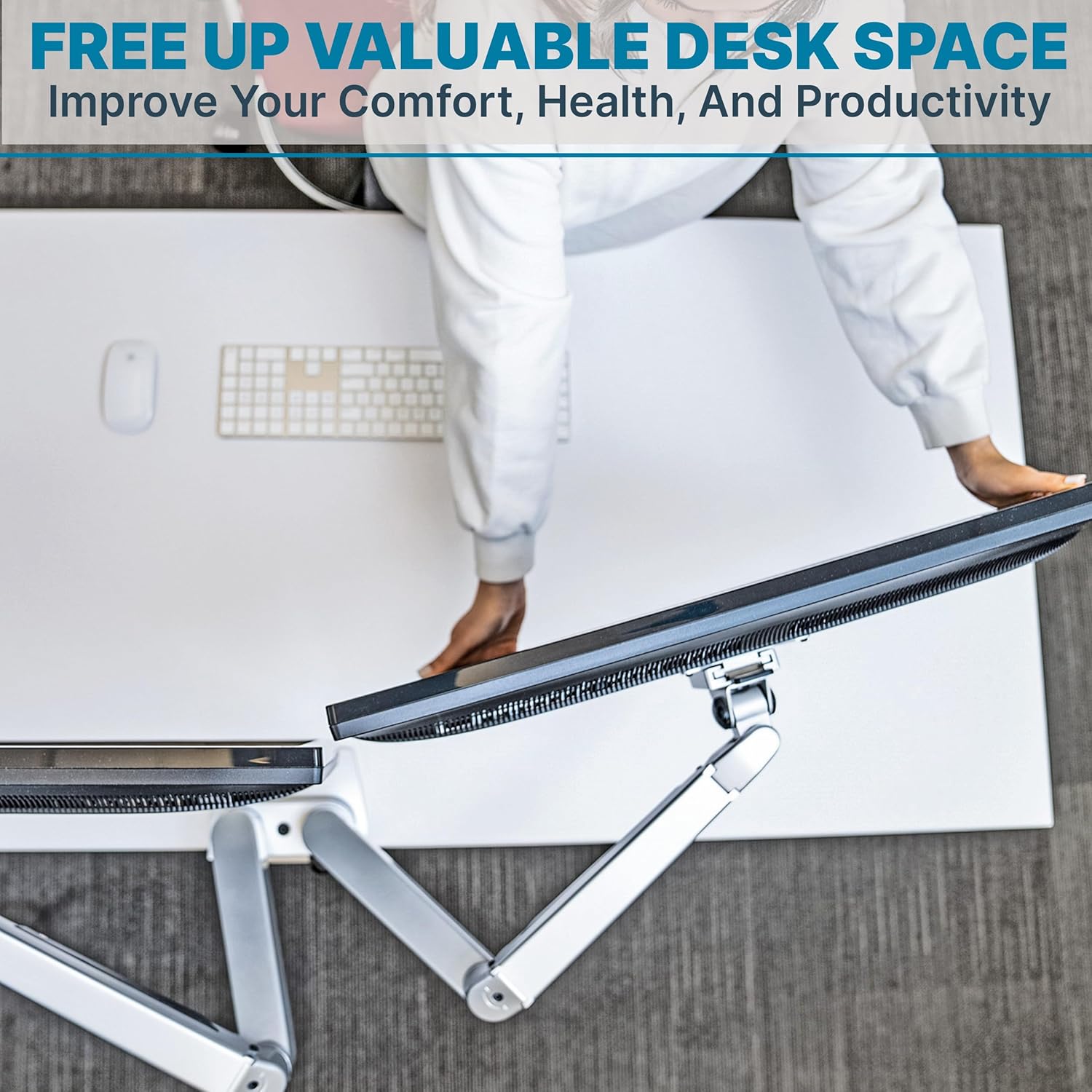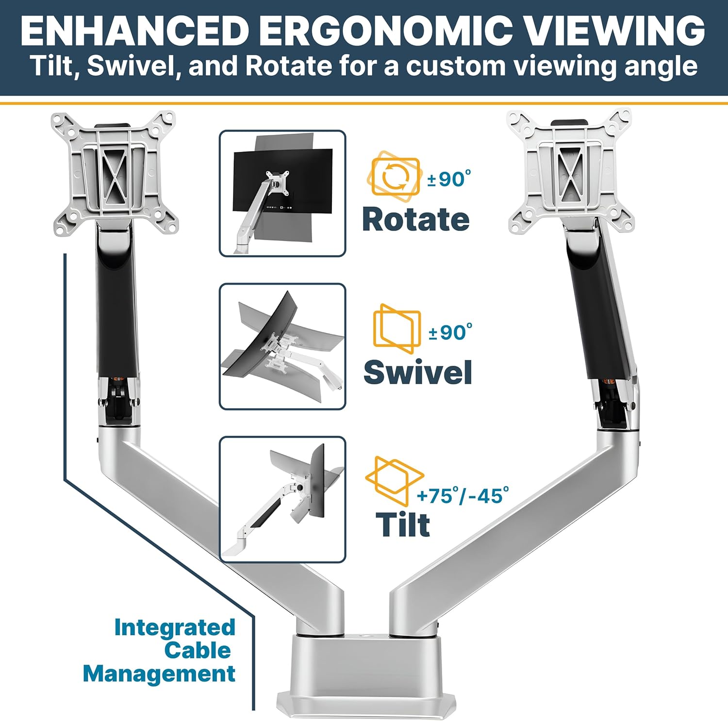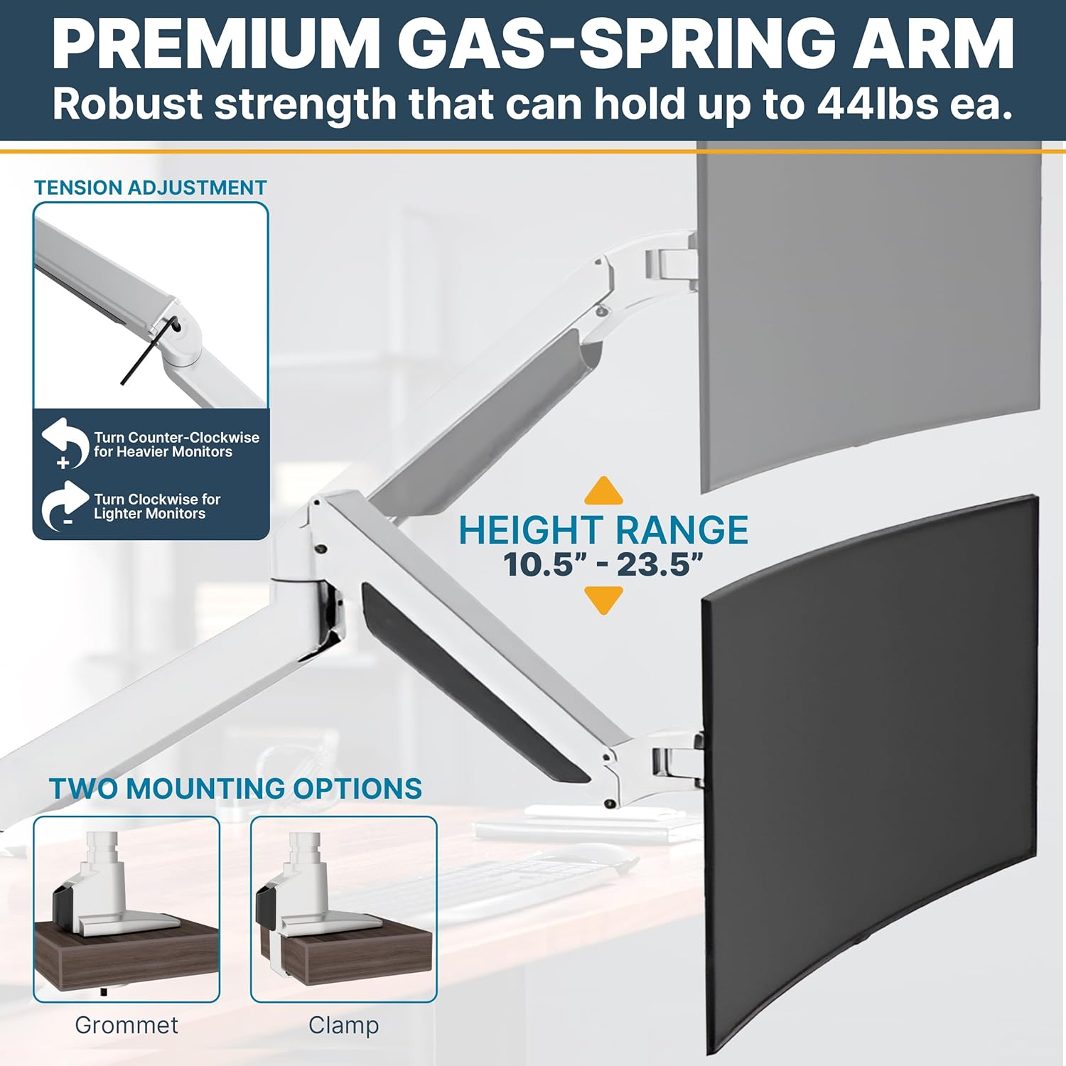 Introducing the Restore Furniture Premium Aluminum Dual Monitor Mount, a high-quality counterbalance desk mount. It features a built-in elbow gas spring gauge for precise weight adjustment, transparent cable management, and a convenient quick-release VESA plate, ensuring effortless and efficient monitor installation. Upgrade your workspace with this premium solution that combines functionality and aesthetics. , Experience enhanced stability for dual monitors with our upgraded steel base, premium gas spring, and large arms. This robust mount securely accommodates two 13”-34” screens, each weighing up to 44lbs. It’s compatible with VESA 75x75mm and 100x100mm, ensuring a versatile and secure display solution for your workspace. Upgrade to unparalleled stability and performance for your dual monitor setup. , Enjoy complete adjustability with our monitor arm, providing a remarkable range of flexible motion: +70° to -45° tilt, 180° swivel, 180° rotation, and 13 inches of smooth height adjustment with gas spring lift. Tailor your workspace for optimal comfort and productivity. , Versatile mounting choices enhance your setup – a robust steel desk clamp offers excellent support, and an equally secure grommet mount caters to various desk layouts. Recommended for desktops with thickness ranging from 0.4” to 3.3” with clamp and 0.4” to 1.9” with grommet. Tailor your mounting preference for a secure and adaptable display solution. , Enhanced gaming experience: Dual monitor arms allow for seamless multi-screen setups, essential for immersive gaming, expansive virtual workspaces, and heightened situational awareness in competitive play. , Experience guaranteed excellence and function with our sturdy aluminum design, supported by a 5-year Manufacturer Warranty. Our Guarantee, Your Peace of Mind. ,