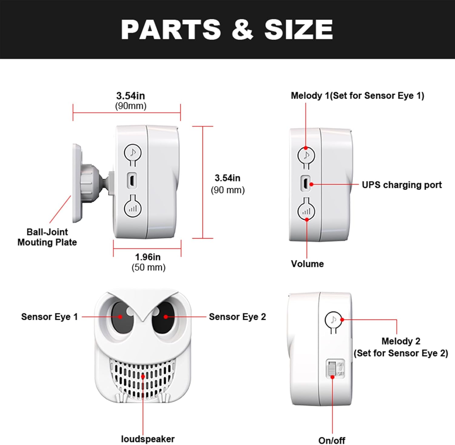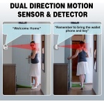 Wide Range Of Applications:The indoor motion sensor built-in high quality speaker and 35 optional chimes&voices which can be used for Household & business as the welcome/reminder/alarm device. Ideal for office/store/warehouse/doors/kitchen/bathroom/garage/porch/shed and etc , Dual-Direction Motion Detector:The detector has two sensor eyes match different sensor eye with different chime/voice. Such as when you back it will say “ Welcome Home “ ; and when you leave it will say “ Remember to bring the wallet,phone and key” , No Need Replace Batteries:The detector is powered by built-in rechargeable battery and can be charged by the included USB cable. It can work more than 30 days once fully charged. (if the detector be activated 50 times per day) , Reliable & Flexible: The motion sensor will detect moving people from 35 feet(10 meters) in front of it. Improved motion detection chip and detection angle to reduce the false alarms. It has 35 optional chimes&voice and 5 adjustable volume levels to match different application scenario , Super Easy to Operate:Super easy to setup, the installation time can be as little as a few minutes. Just turn on the motion sensor and select the activate voice as you need, place it on the wall,table or any other surface ,