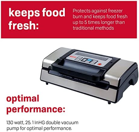 OPTIMAL PERFORMANCE: 130 watt, 25. 1 InHG double vacuum pump for optimal performance. Ensures maximum air extraction when sealing larger food items