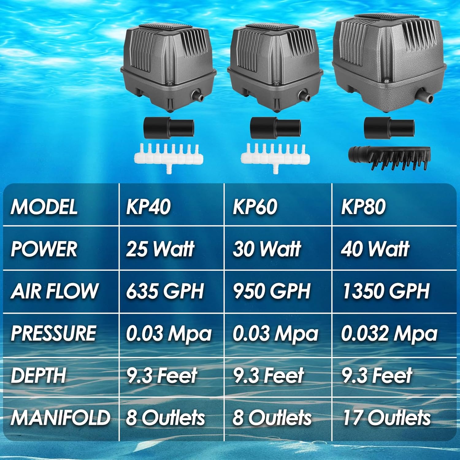 SPECIFICATION – Model KP80 with a 40W motor, 1350 GPH (85 LPM) flow rate, and 0.032 MPa (4.64 psi) air pressure. The motor has a full copper coil for high efficiency, low heat, and low power consumption. Delivers strong air output and pressure. , QUIET OPERATION – The pond aerator pump features multiple noise reduction designs for quiet running, including a sealed air chamber, rubber & silicone buffers, and a magnetic-driven diaphragm. , HEAT DISSIPATION – This pond bubbler features an aluminum alloy housing surface that significantly improves heat dissipation efficiency. This design helps reduce the risk of overheating and extends the overall lifespan of the pump. , MULTI-PURPOSE – This versatile pump can function as a koi pond aerator (enhance oxygen supply for fish), a hydroponic air pump (aeration to stimulate root growth), or a septic air pump (boost waste decomposition). ,