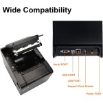 【Fast Printing & Auto Cutter】The pos printer high efficiency with auto cutter and the fastest printing speed–250mm/sec. Easy for paper installation, Easy maintenance, and excellent structure.Plug and play USB PORT, easy to use.Three Interface ports:USB+ LAN + SERIAL PORT.DO NOT-Wifi-Bluetooth.Support WIN2003/WINXP/WIN7/WIN8/WIN10/LINUX/Mac , 【Wall Hanging Design】 Kitchen printer with two hanging holes on the bottom support wall mount hanging. Easy to use, save the place. With auto cutter and compatible with several operating systems. Print width:79.5±0.5mm; Paper Width:3 1/8″ (80mm). , 【Wide Compatibility&Reasonable Design】Desktop or wall-mounted type for option, lets you use every space more rationally. The humanized auto-cutter, the receipt will not fall to the ground after printing. One-button open cover and large paper warehouse design, easy to use & maintain. Work with MUNBYN 3 1/8 x 203ft thermal paper,MFLABEL thermal receipt paper. , 【Most Cost-effective】Support cash drawer driving, compatible ESC/POS print commands.Do not need ribbon/ink cartridge, low operating cost. The printer has the function of overheating protection, long service life. Printing characters with high speed, reliable performance.It is an ideal choice for receipt printing in large shopping malls, supermarkets, retail, hotels, canteens, restaurants, etc. , 【Buy with Confidence】 Rongta is a brand that is dedicated to offering the highest quality products and good shopping experience for the customer. Warm tips:The receipt printer is not compatible with Ubereats/Grubhub/Doordash/Lightspeed/Postmates/Square/Chromebook/Clover. ,