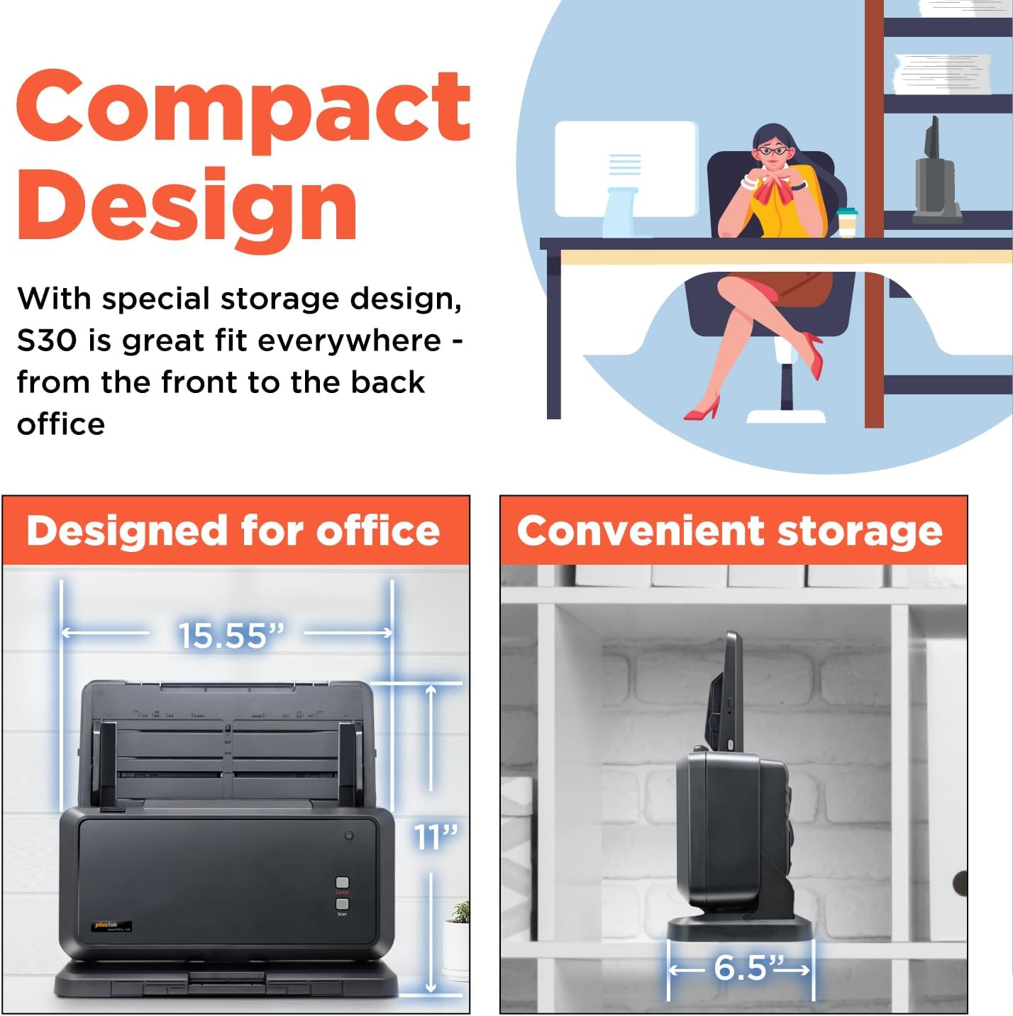 [Office-friendly] – The S30 can scan documents up to 12 inches wide, meeting a wide range of business needs. A fast, powerful, large-format desktop scanner ideal for high-volume office use. , [Cost Savings] – The S30 can scan A4/Letter size and 12″ wide documents at the same time, so you won’t have to spend extra on a separate scanner just for a few wide-format documents. , [Flexible Paper Handling] – The S30 handles a wide range of documents, from standard office paper in various sizes to blueprints, architectural plans, and engineering drawings, as well as thin papers like purchase orders and delivery notes. , [Broad Compatibility] – Horizontal mode suit for matrix printer paper, thin or fragile documents can use carrier sheet protect during scanning. larger than Tabloid but smaller than Cut Sheet size, fold in carrier sheet and scan to save as a single image , [Job Button] – The included software lets you register frequently used scanning tasks to the job button on the scanner. Once set up, you can simply press the job button to perform one-touch scanning. , [Automatic Paper Detection] – You don’t need to set the scan size for each document. The scanner automatically detects the size of each sheet, removes any blank pages, and optimizes the image, even when scanning continuously through different sizes. , [Fit in your workspace] – The S30 is only about 4 inches wider than standard scanners, but it can handle Tabloid size and even 12″ wide documents. Plus, you can store it upright when you’re not using it to save space. ,