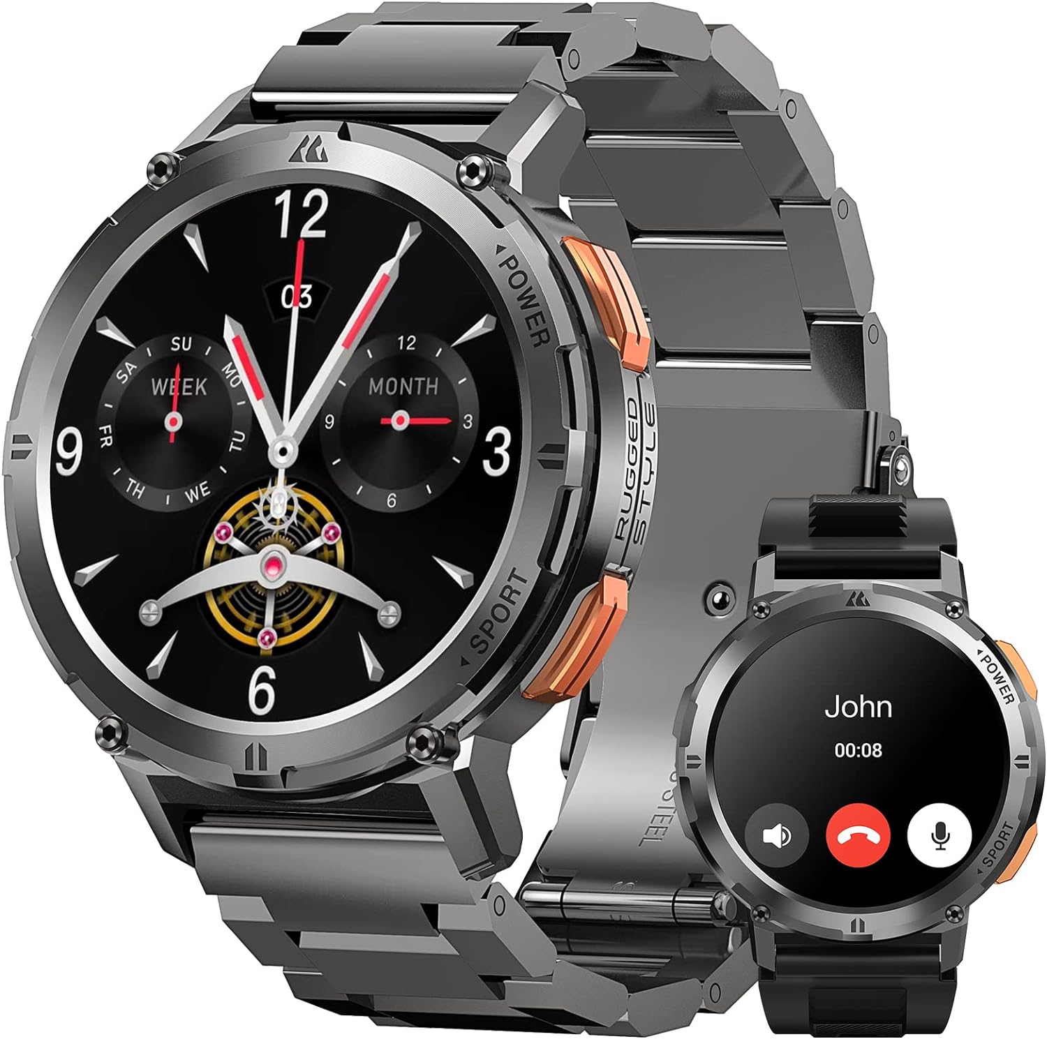 ⌚MILITARY-STANDARD QUALITY- AMAZTIM T2 features 1.43-inch third generation Corning Gorilla screen , Double glass plate Mohs hardness up to 9H, it’s strong enough to deal with a range of screen-destroying behaviors. The TC4 titanium unibody and two-color metal keys is the world’s first two-color integrated smartwatch; military-grade materials and fully enclosed design makes it the toughest and sturdiest watch. Successfully passed 12 Military Tests Including, extreme temperature,dust resistance, salt spray, fluid pollution,etc. Certified to MIL-STD810H , Our smart watches for men ensures that you use them confidently in a variety of harsh conditions. , ⌚50M WATERPROOF /EXTREMELY RESISTANT TO DAMAGE – Incredibly strong and corrosion-resistant titanium case has been used to enclose and giving cover, the rugged military grade smart watch with fully enclosed ultra-thin case design can be easily submerged into 50M (IP69K waterproof) deep water. Our durable smartwatch has withstood the extreme conditions and passed drilling, crushing and hot steam washout tests, making our sports watch suitable to use under high temperature and pressure. , ⌚WHY CHOOSE AMOLED DISPLAY – ①Clearer vision under sun – T2 equipped with 1.43 “HD AMOLED always-on color screen,First anti-glare technology on the glass bezel cover, giving the watch clarity and excellent visibility when outdoors;②Clearer -T2 adopt screen spotlight technology with up to 100%RGB color gamut, brightness of 1000NIT and a resolution of 466×466,which is twice that of others smart watches. giving you clear and vivid visual experience;③Always-on dispalys-You no longer need to lift your wrist or touch the screen to check the time,the display never sleeps;④More energy-saving-AMOLED displays can control how each pixel illuminates,it tends to be more energy-efficient than LCD displays , ⌚60DAY+ ULTRA-LONG LIFE BATTERY – AMAZTIM T2 is equipped with a 100% pure cobalt-based battery (military grade), the battery capacity is as high as 410mAh ensuring optimal performance and longevity which is twice as much as that of conventional smart watches. At the same time, super power-saving AI algorithm breaking the industry is adopted to minimize power consumption, enough to last up to 2 weeks under normal use, and can continue to use sports mode, health index measurement and other functions for up to 60+ days in power-saving mode. With a quick 10-minute charge, you can have enough battery backup to last for up to 3 days. , ⌚INDUSTRY-LEADING DUAL SMART CHIP – ① AI Voice Assistant & Make Calls: A very handy tool built in the watch. Use your voice to give instructions and the voice assistant will do the rest. You can ask questions, play your desired music, and check weather, set alarms and timers. You can also make voice calls through the voice assistant, makes the scenes that are inconvenient to hold a mobile phone in daily exercise and life more concise and smart. ② Intelligent sports recognition: features BioTracker PPG optical sensor and the advanced AI algorithm,AMAZTIM T2 enables smart recognition of 6 sports. The system can automatically sense current sports status without entering Sports Modes manually. , ⌚24H HEALTH MONITORING /70 EXERCISE MODES – AMAZTIM T2 collects the health data with its advanced real-time monitoring function. The fitness watch helps you monitor All-day sleep, 24-hour heart rate, and real-time blood oxygen. The fitness tracking watch includes a pedometer to keep track of the calories burned throughout the day. Supports up to 70 sports modes including indoor and outdoor exercises such as hiking, skiing, swimming, etc. The smartwatches collects the data with pinpoint precision and accuracy, ensuring that every workout is counted.