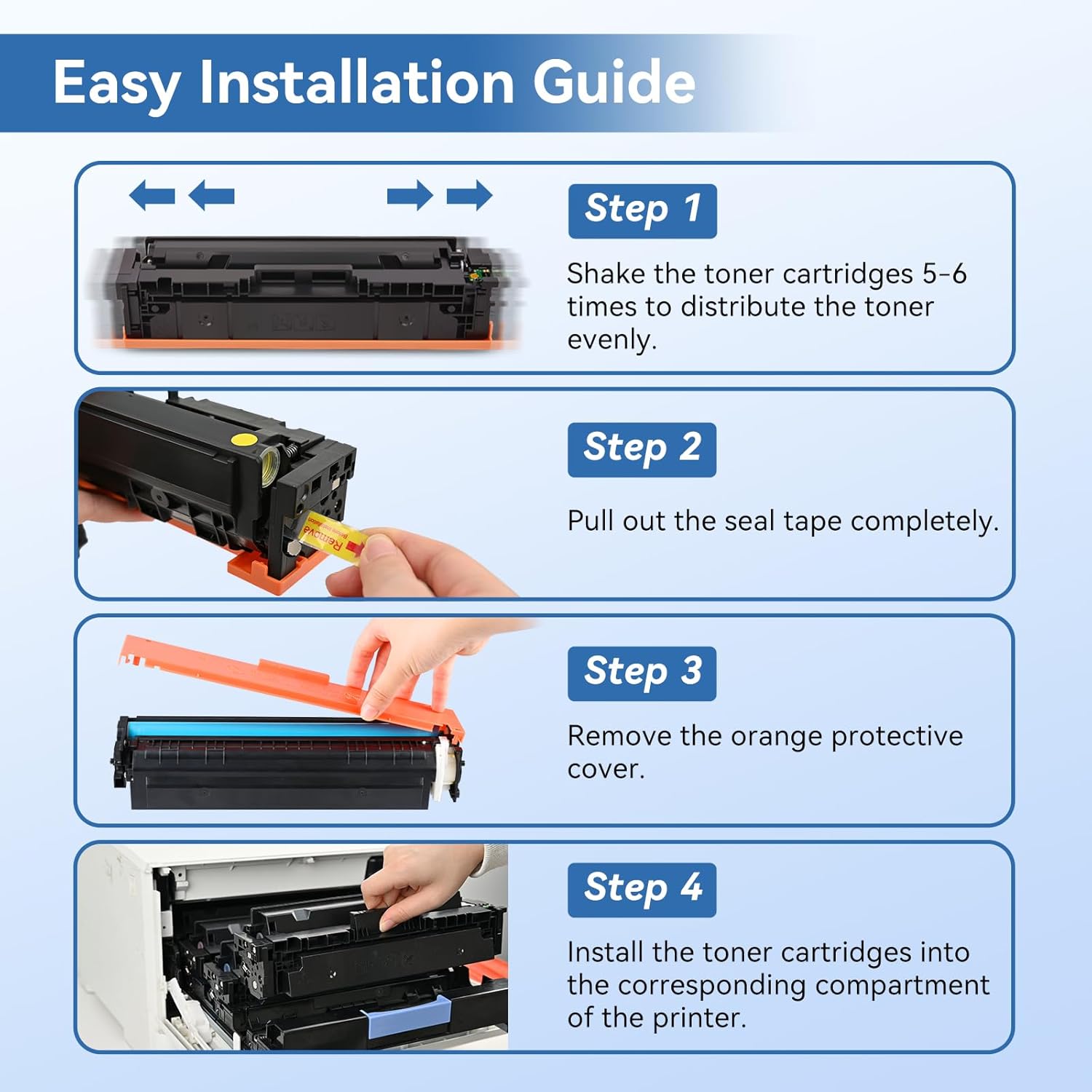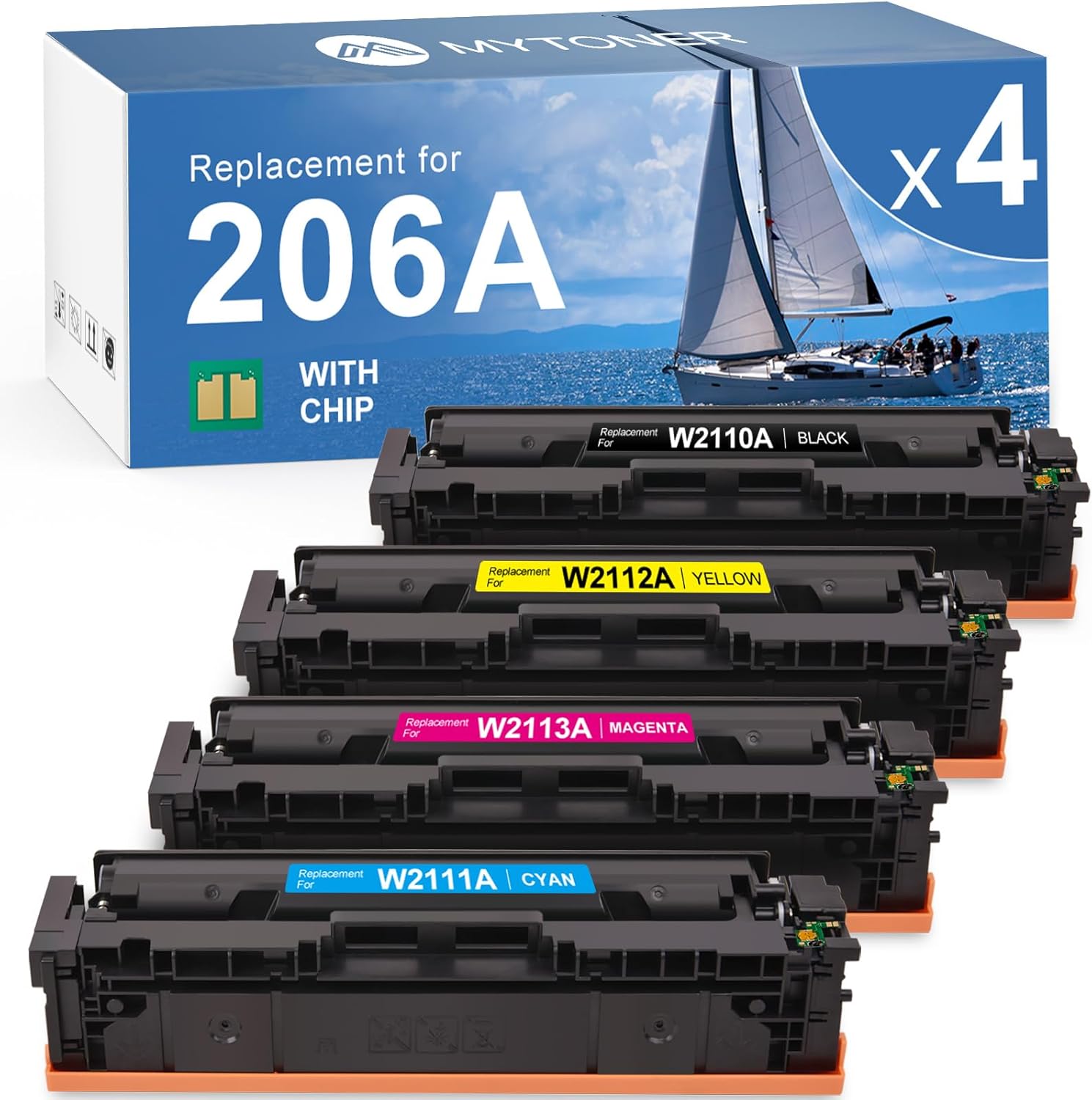With Chip: 206A Toner Cartridges replacement for HP 206A 206X Toner Cartridges 4 Pack High Yield Set with built-in smart chips are engineered to ensure strong compatibility and accurate recognition. NO need to remove and install the OEM chip manually , Package Contents: 4 Pack 206A Toner Cartridges replacement for HP 206A 206X Toner Cartridges High Yield (1 x 206A W2110A Black Toner, 1 x 206A W2111A Cyan Toner, 1 x 206A W2112A Yellow Toner, 1 x 206A W2113A Magenta Toner) , High Page Yield: Up to 1,350 Pages for 206A black toner cartridge, Up to 1,250 Pages for each 206A color toner cartridges (Letter/A4, at 5% coverage) , Compatible with HP Printers: Color Pro M255dw M255nw Toner Printer, Color Pro MFP M283fdw M283cdw M282nw M283fdn Toner Printer compatible with 206A 206X Toner Cartridges HP Set , All toner cartridges replacement for HP 206A 206X Toner Cartridges 4 Pack are strictly manufactured to ensure the premium print quality, which offers accurate colors and long-lasting texts, bringing every detail to life ,