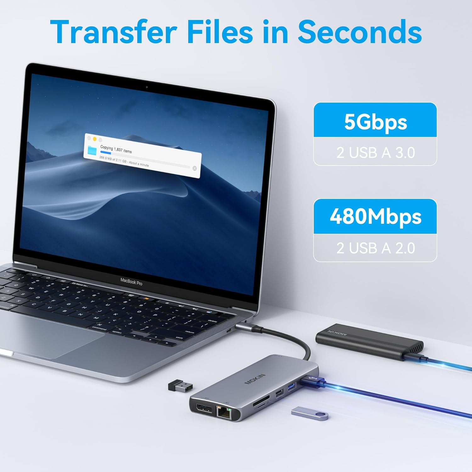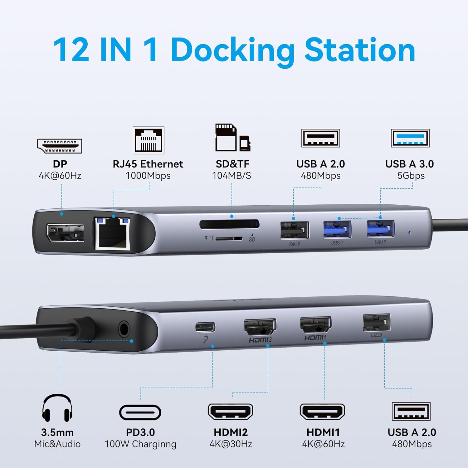 【12 IN 1 Laptop Docking Station Dual Monitor】:This USB C laptop docking station with 12 ports,2 x 4k @60Hz HDMI,1x DP,2x USB A 3.0 , 2 x USB A 2.0 ,1 x Gigabit Ethernet,1x 100W PD charging,1 x SD/TF,1 x3.5mm Audio Jack.This is a multiport adapter with powerful functions , 【Triple Display & Ultra HD 4K Output】:Windows supports MST and SST (Mirror & Extend modes). HDMI 1 can output up to 4K@60Hz with a DP1.4 source. When two monitors are connected, HDMI resolution will be 4K@30Hz, and with dual or triple displays via DP, the resolution will be 1080P@60Hz.Note: Please note: Mac OS DOES NOT support triple display, it only support mirror mode and non-mirror mode. Non-mirror mode means that the three external monitors are same but different from laptop , 【Efficient Data Transfer & No Need Driver】:The multiport USB-C docking station is plug-and-play, with no driver required. It features 2*USB 3.0 ports (up to 5Gbps) for fast data transfer-perfect for HD movie transfers in seconds and 2*USB 2.0 ports for connecting peripherals like a keyboard or mouse with no lag. Ideal for a wide range of applications , 【PD Fast Charging & Stable Gigabit Ethernet】:The USB C Dock offers up to 100W PD input and 87W output, ensuring your laptop stays charged while connecting multiple devices. Enjoy faster, more secure internet with the stable Gigabit Ethernet, ideal for bypassing unreliable Wi-Fi. Simply plug in the USB-C hub and Ethernet cable for ultra-fast browsing. Plus, the 3.5mm audio port supports speakers or mic for enhanced audio , 【Strong Compatibility】:Our Computer Docking Station suitable for most laptops and compatible with Dell XPS13/15,Lenovo Yoga 720/910/920/930,Microsoft Surface Book 2/ Surface Go/ Surface Laptop 3,Dell Latitude 13 7000/Latitude 13 E7370 etc ,
