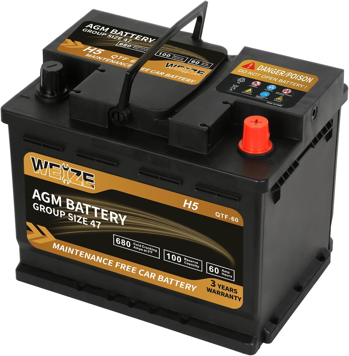 Weize Platinum AGM Battery BCI Group 47-12v 60ah H5 Size 47 Automotive Battery, 100RC, 680CCA, 36 Months Warranty